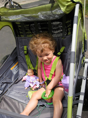 Check out Haley's new ride. We weren't sure how she was going to like it considering she hates being confined, but she did GREAT. Daddy pulled her on the back of his bike while I rode along side of them on my bike. She loved waving at me. : )
